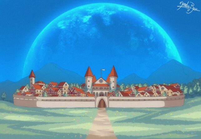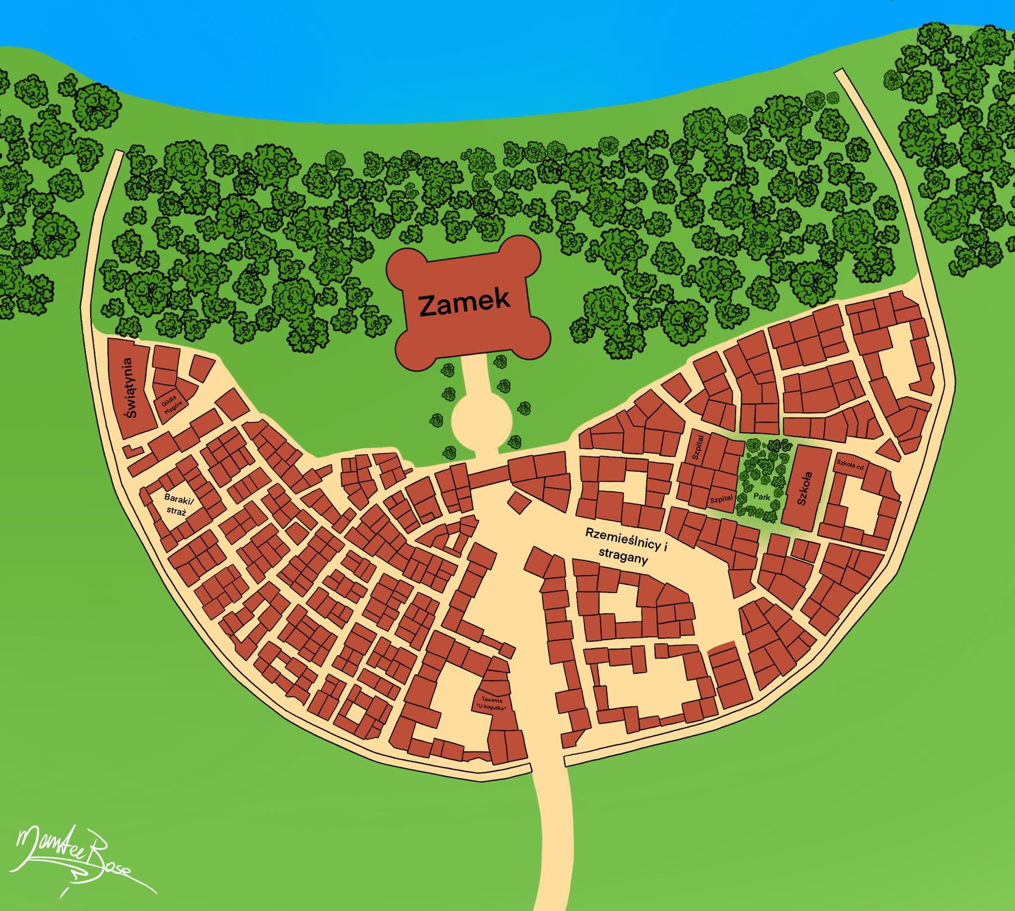 Przede wszystkim o ile wiedziałam jak wygląda zamek Trysylionu czyli miejsca w którym zaczyna się akcja tak nie miałam nigdzie zwizualizowanego ujęcia na miasto dookoła niego a tego wymagał mój storyboard już na pierwszej stronie komiksu. Tak więc do zamku doprojektowałam jako-taki plan miasta mniej więcej zgodny z moją wizją w głowie oraz ujęcie na jego widok „od przodu”.