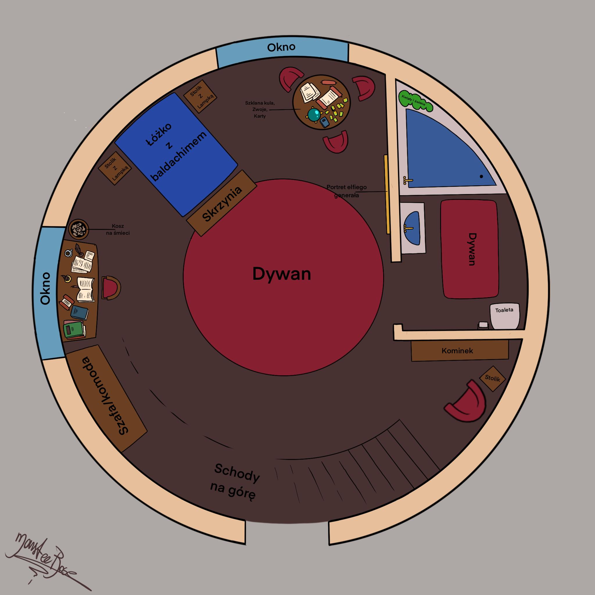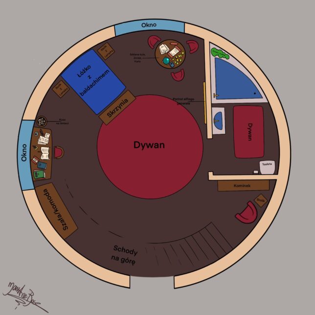 Nie jestem mistrzem rysowania tła i lokacji więc może nawet jeśli nie jest to wybitne dzieło jestem dumna, że przemogłam się i to zrealizowałam^^ Dodatkowo w trakcie robienia stroryboardu wyszło to, że przydałoby się znać plan pokoju mego głónego bohatera – Rayertha.